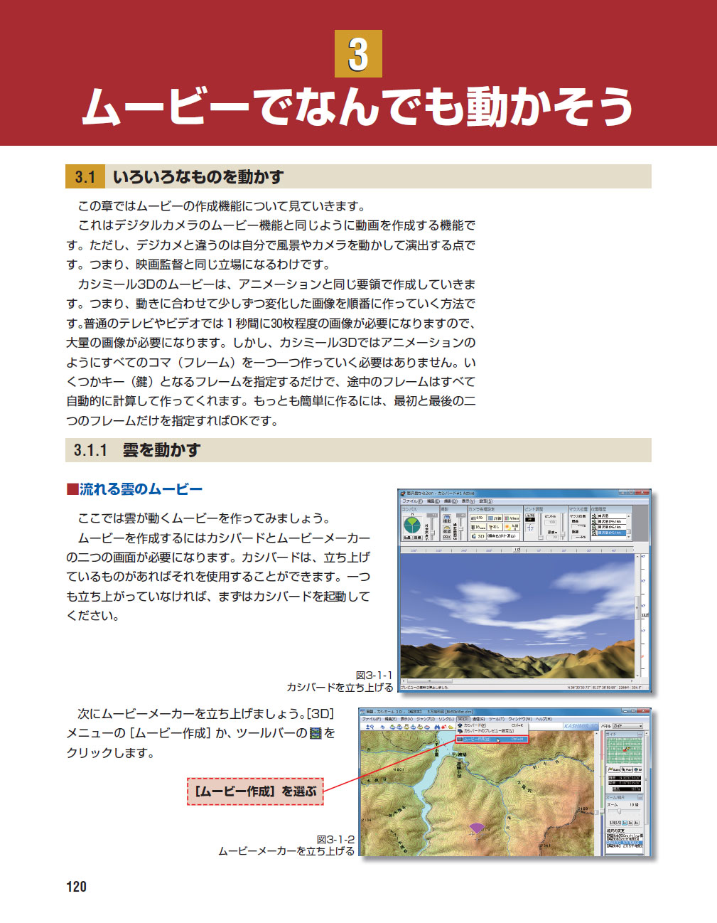 カシミール3Dの機能のうち、カシバード、ムービーメーカ、データ作成、各種地図の使用法など中心として、さらに細かい高度な機能に至るまで解説しています。