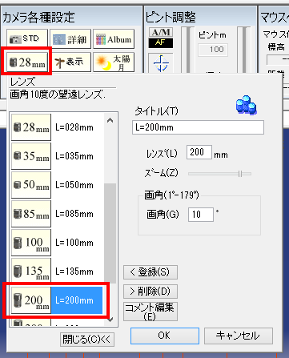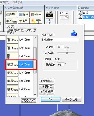 レンズのリストが出たら、適切な長さのレンズを選びます。ここでは28mmのレンズを選んでみました。