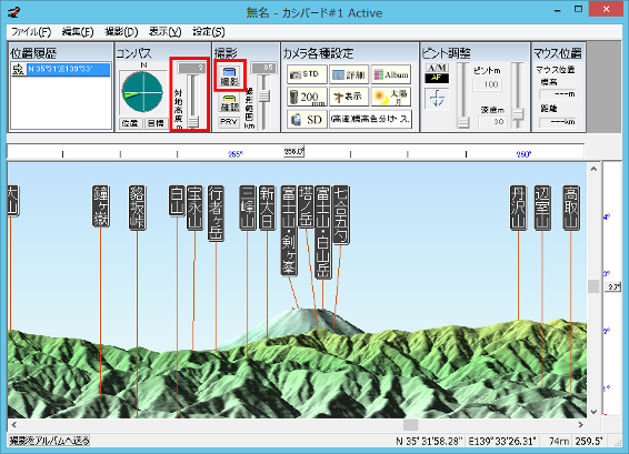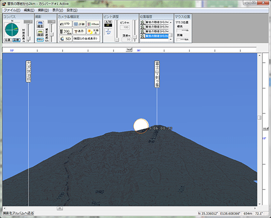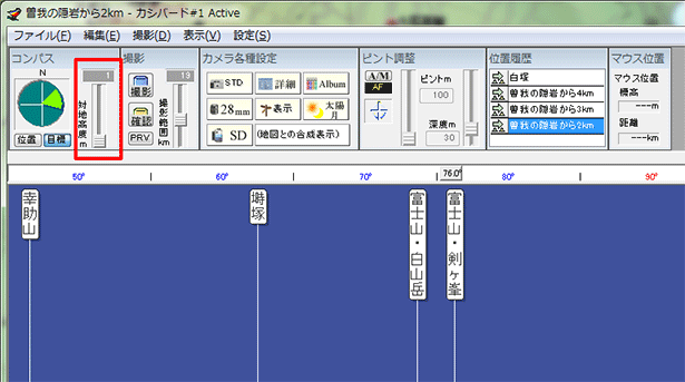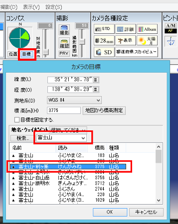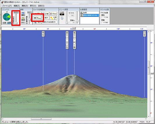 なお、富士山が表示されないような場合は、[撮影距離]が短すぎることがあります。この場合は、富士山までの距離くらいに設定してください。長すぎると描画に時間がかかりますのでご注意。