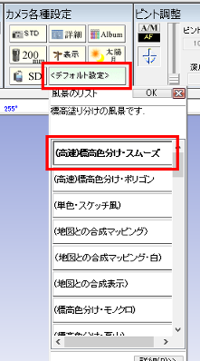 風景のリストが出たら、シンプルな[標高塗り分け・スムーズ]を選びます。ほかにも(高速)のマークの付いた物であればOKです。