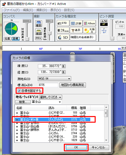 富士山(剣ヶ峰もしくは白山岳)が下のリストに出ますので、これを選択して、[OK]を押します。 |