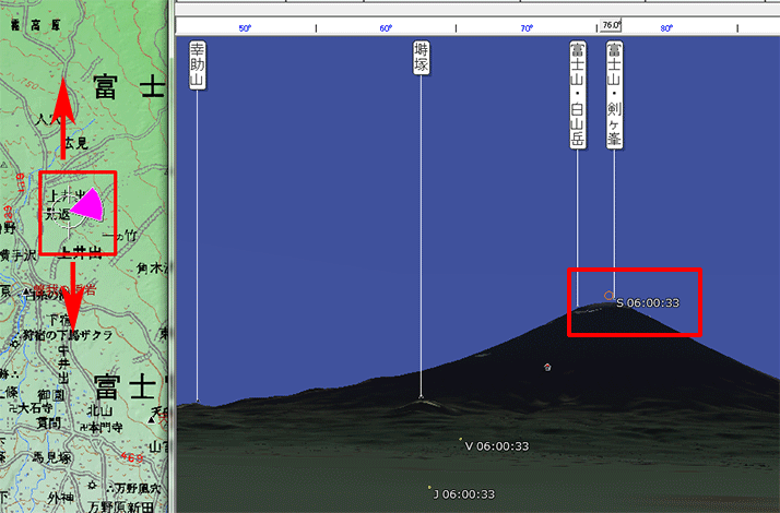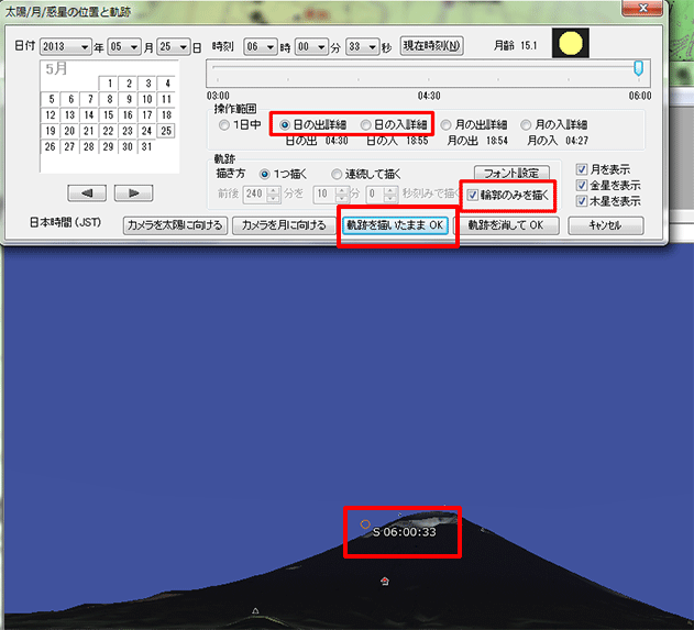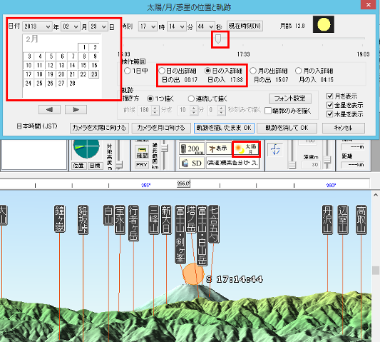 太陽/月/惑星の制御パネルが出ますので、富士山に太陽が現れるように、日時を調整してください。