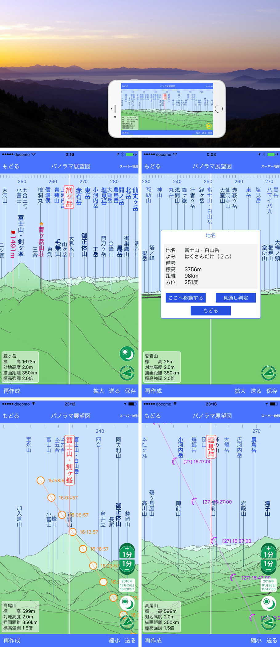 ・富士山まで距離がある場合は、表示できないことがあります。このときは都度「撮影」を行うか、■場所を指定して日時を求める場合(遠望のとき)の方法を使用してください。