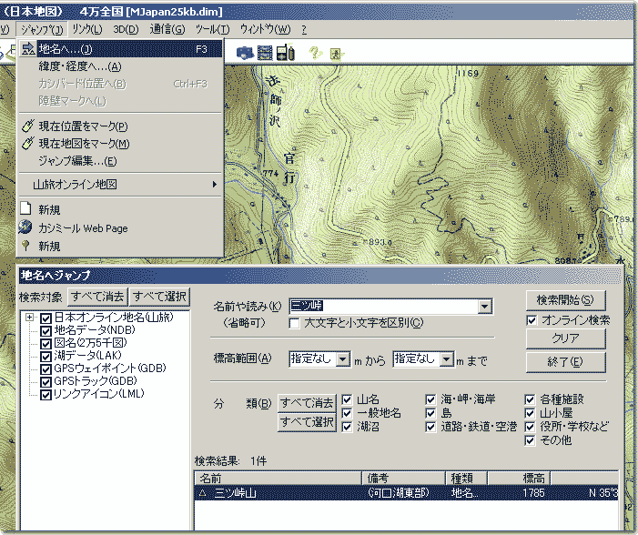 [ジャンプ]−[地名へ]を選択して、描きたい場所がありそうな地名を入力します。そして、[検索開始]を押してください。