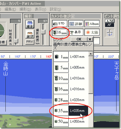 リストにないレンズの長さは、[詳細>]ボタンを押すと、自由に作ることができます。また、画角で直接指定することも可能です。画角で指定する場合は、179度から1度までです。