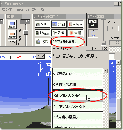 <デフォルト風景>という名前のボタンを押すと、選択できる風景がリストになって出てきます。