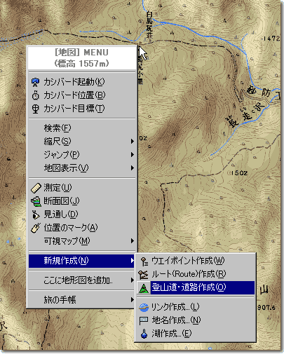続いて、メニューで[新規作成]→[登山道・道路作成]を選びましょう。