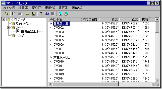 この画面の左側のなかから、[ルート]を選んで見てください。 さきほど作った白馬岳のルートがあることがわかります。 さらにそのルートをクリックすると、ルートを構成している点の一覧が出てきます。