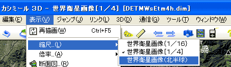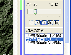 小縮尺の画像を開くには、[ファイル]メニューのなかから、[地図を開く]を選び、[スカイビュースケープ]のカテゴリの中の「世界衛星画像1/16」または「世界衛星画像1/4」を選んでください。