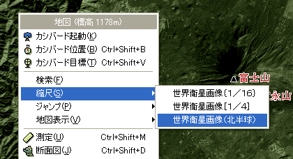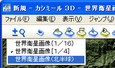 大縮尺の画像を直接開くには、[ファイル]メニューのなかから、[地図を開く]を選び、[スカイビュースケープ]のカテゴリの中の「世界衛星画像(北半球)」を選んでください。