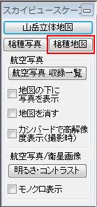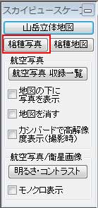 ■槍穂詳細地図を開く ウインドウの右側にあるパネルの中の[スカイビュースケープパネル]から[詳細山岳]を押してください。 ![]() もしくは、[ファイル]-[地図を開く]メニューから、[スカイビュースケープ]のフォルダを開けて、[(槍穂)詳細山岳立体地図画像]のいずれかを選択してください。 ■槍穂航空写真を開く ウインドウの右側にあるパネルの中の[スカイビュースケープパネル]から[槍穂写真]を押してください。 ![]() もしくは、[ファイル]-[地図を開く]メニューから、[スカイビュースケープ]のフォルダを開けて、[(槍穂)写真]のいずれかを選択してください。 ■その他の操作方法 その他の操作方法は、「航空写真(空中写真)の使用法」と同じです。 |