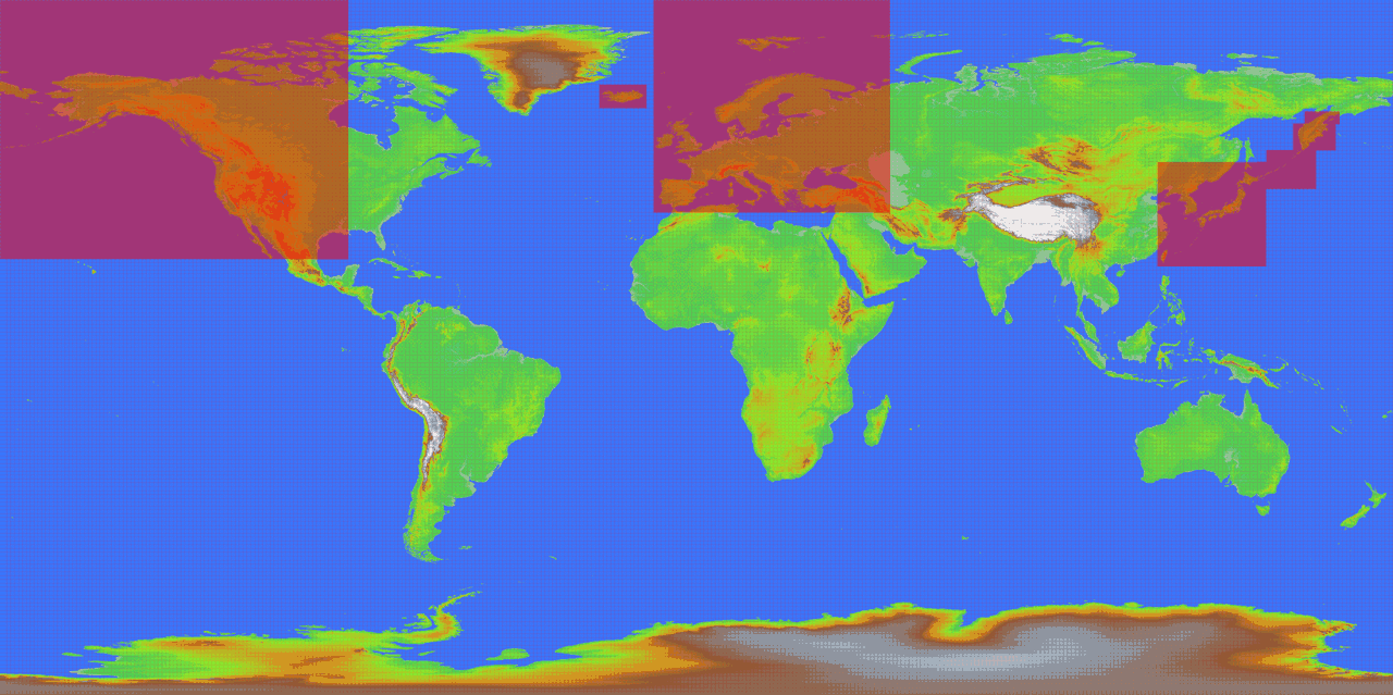 今回、新たに提供する範囲を加えて現在の北アメリカの提供範囲は、左図の赤く塗りつぶした部分です。現在の提供範囲の全体はコチラです。 今回の追加部分は西経110度〜西経90度の範囲です。 衛星画像の解像度は最大15mです。一部、雲に覆われた地域がありますのでご了承ください。 カシバードでの3D表示ももちろんOKです。 リアルタイムにダイナミックな風景を楽しめます。 |