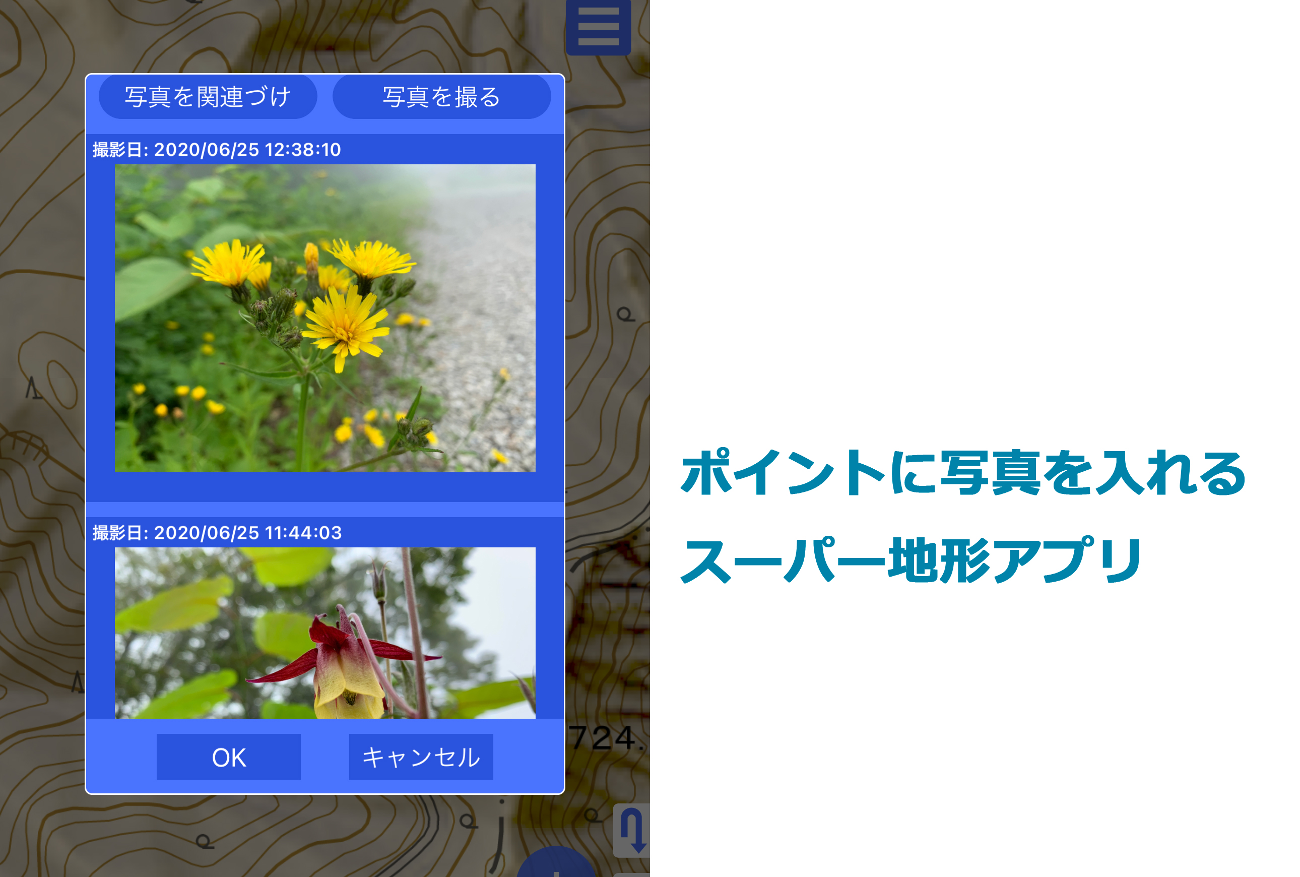 スマホの写真ギャラリーに保存されている写真と、トラック軌跡の時刻を比べて、自動的に写真が表示される機能です。