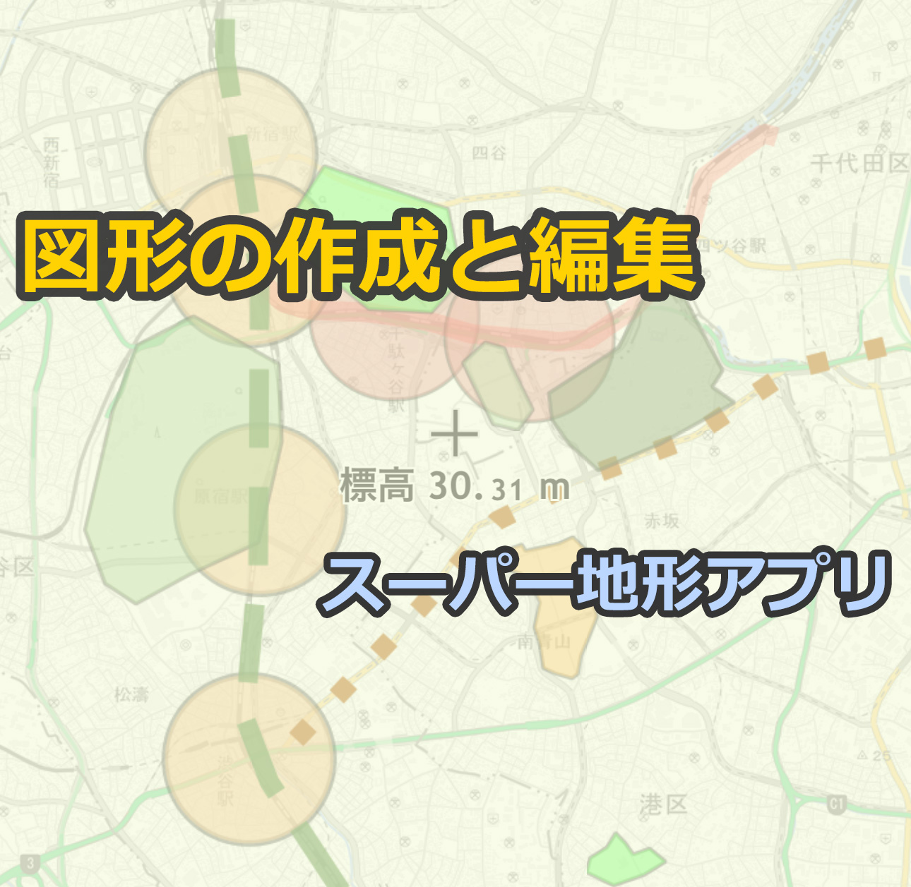 地理院地図で描いた図形などもGeoJSONで保存すれば、スーパー地形で表示できます。