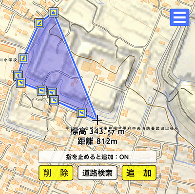 図形の描画のうち、ポイント(点)、円、ライン、ポリゴンは、地図の中心の十字マークのあるところに、作成を開始する場所を合わせて、ボタンをタップします。