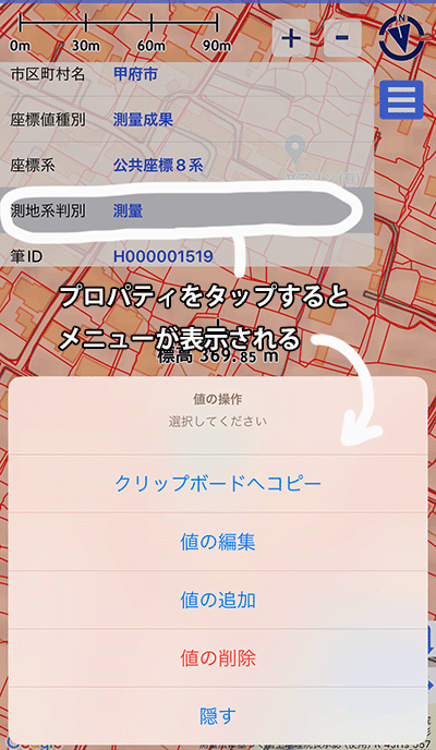 プロパティ画面をタップすると、下記のメニューが選べます。