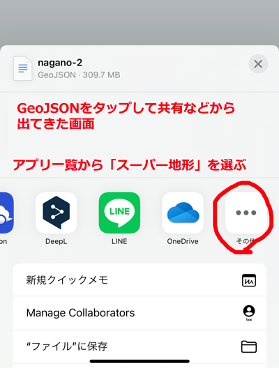 Webからダウンロードしてデータやクラウドドライブに保存したGeoJSONファイルをタップして、「アプリで開く」や「共有」メニューから、アプリ一覧が出るのでスーパー地形アプリを指定してください。