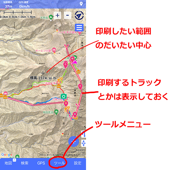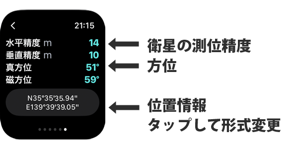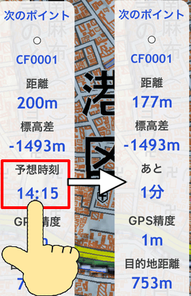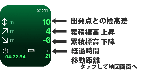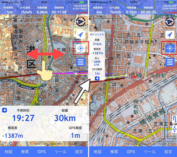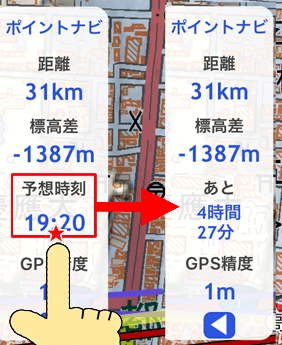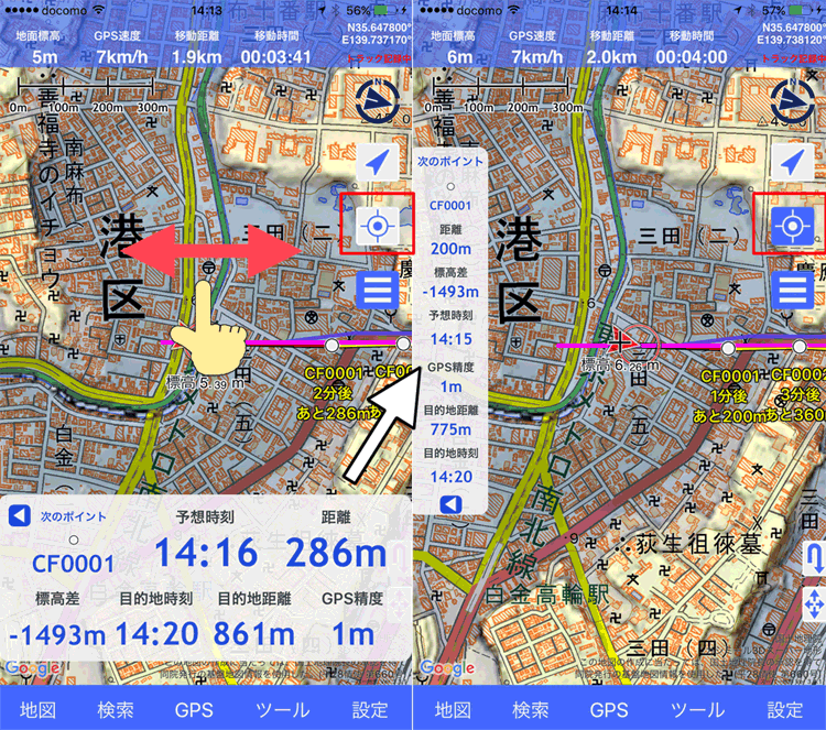 GPS標高は数字を押すと、地面標高(地図の情報)と切り替えられます。