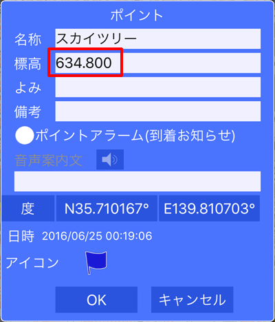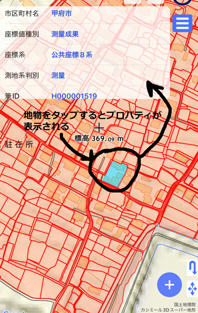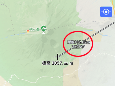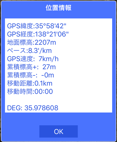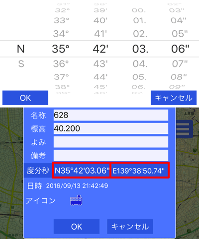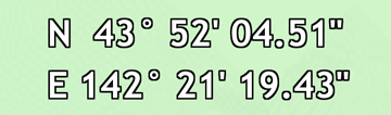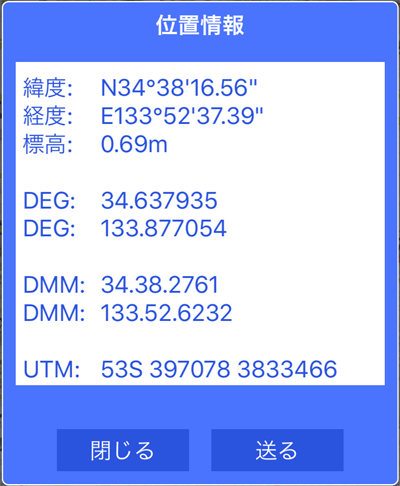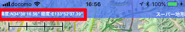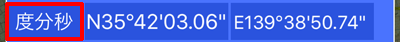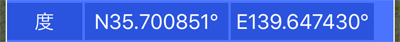右上または左上の緯度経度の表示部分をタップすると、緯度経度の詳細が表示できます。この表示はコピーして他のアプリに貼り付けることができます。