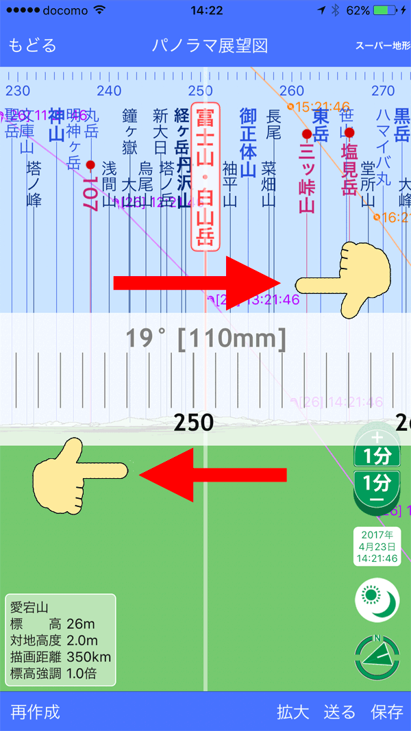 パノラマ展望図の地形は粗いため、とくに近くの山の山頂と引き出し線が一致しない場合があります。