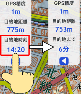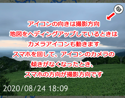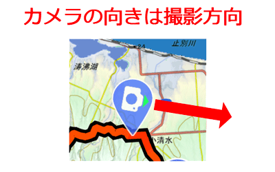 をタップすると、地図の北を上にするか、地図を画面の向きに合わせるか、地図を指で回転するか、切り替えることができます。