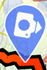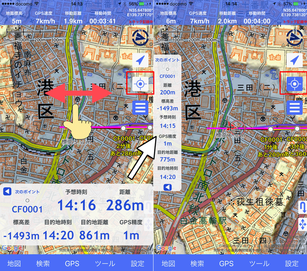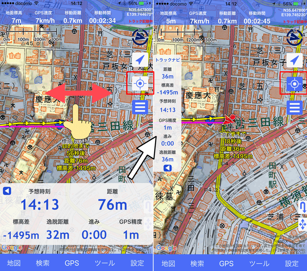 ボタンはGPSをONにして、現在位置が常に地図の中心になるようにします。