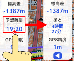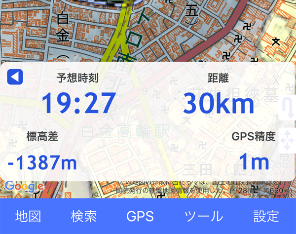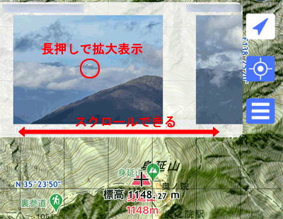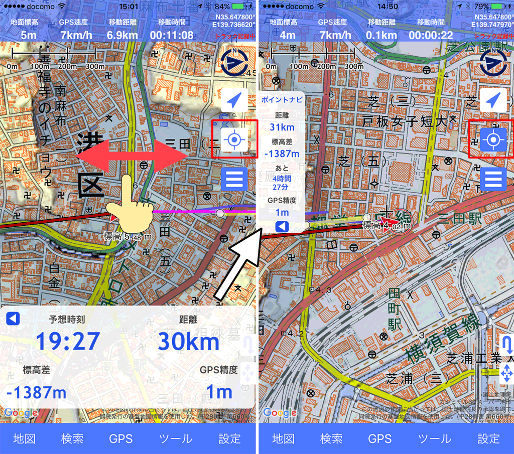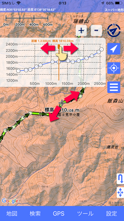 指一本でのズームにも対応しています。地図画面で、指を一回タップして、もう一度タップすると同時に上下に動かすと、拡大縮小可能です。