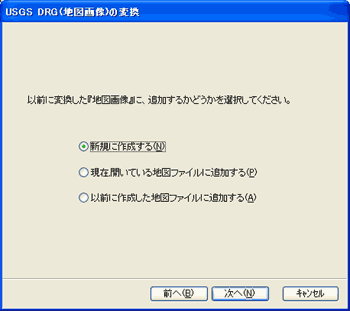 あとからダウンロードしたTIF画像を「ビットマップ地図ファイル」に追加するには、地図の変換の2頁目で [現在開いている地図ファイルに追加する] か [以前に作成した地図ファイルに追加する] を選んで下さい。
